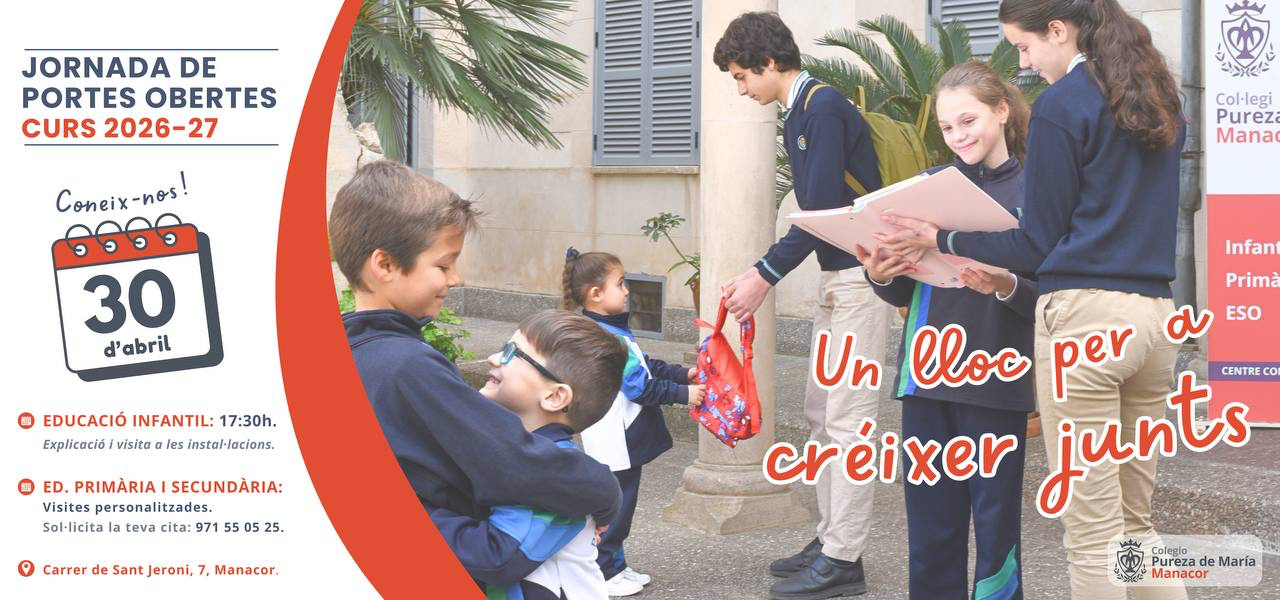 Le informamos de que este sitio web, cuyo responsable y titular es COLEGIO PUREZA DE MARÍA MANACOR, utiliza cookies propias y de terceros, con la finalidad de permitir el funcionamiento de la página web (por ejemplo, gestionar la aceptación del uso de cookies), para analizar o la navegación de los usuarios por ella y con fines de marketing para mostrar anuncios personalizados.